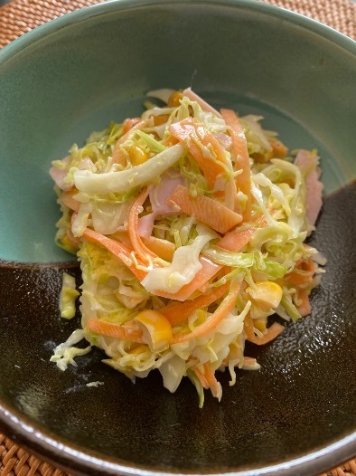 3.キャベツ、にんじんの水気を切ってボールに移し、そこにハムと小さな缶に入ってるスウィートコーンを入れる。