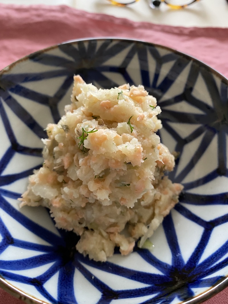 2.柔らかくなったらマッシャーで潰し、スモークサーモン60gを加える。