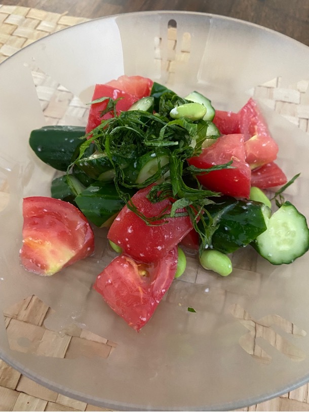 2.トマト中玉か、ミニトマト適量を一口大に切り、きゅうりと一緒にボールに入れ、そこに塩麹大さじ1を加え、あれば枝豆適量を入れて和える。