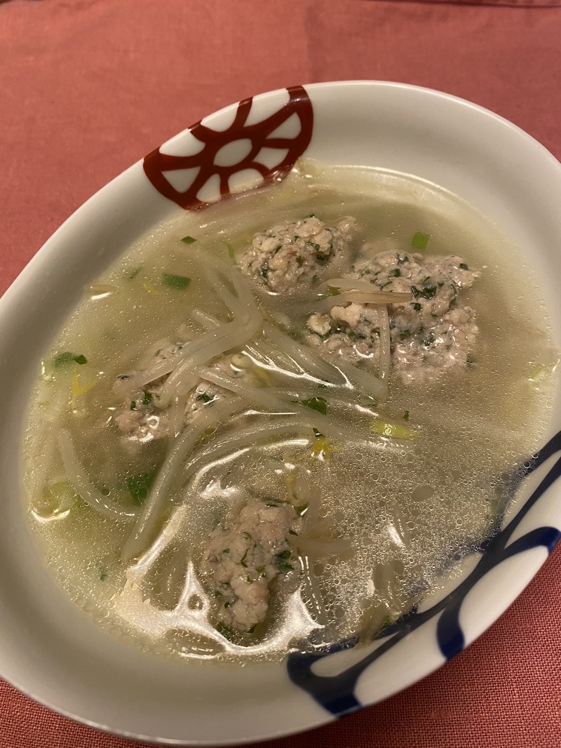 ③そのスープを一煮立ちさせて、そこに鶏団子のミンチを大スプーン2つを使って団子状にして落としてゆく
