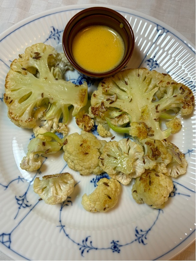 焼けたカリフラワーを皿に並べマオンソースをつけて食べる。