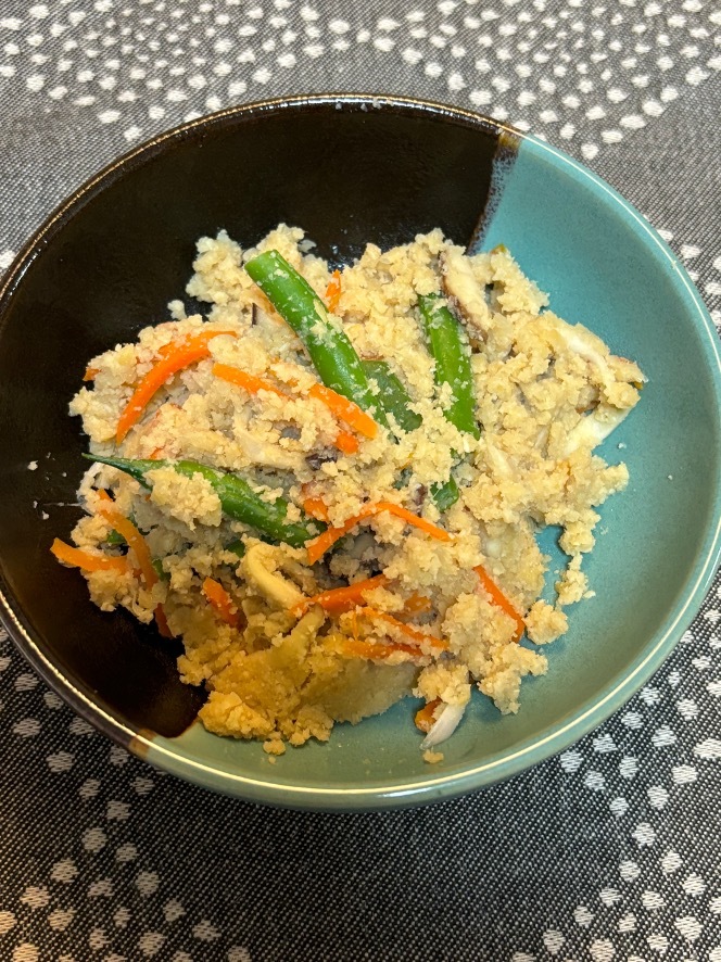オカラを加えよく炒め、酒をほんの少量振り出汁を回しかけて炒め合わせる。