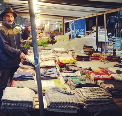 また、その愉しみを支えているのがお店の充実。パリにはストールやマフラーだけの専門店がたくさんあります。今回驚いたのは、ホテルの近くの、火曜日と金曜日だけ開かれる朝市へ行ったとき。肉や野菜やチーズや果物の他に、ストールの専門店が2軒もあったこと。薄いものから厚いもの、無地から柄物など、カシミアを中心にいろいろな生地のストールが並んでいて、しかもマルシェの店舗だけあって、どれも驚くほど手頃な値段。一気にココロが開いてしまって、何枚も買うと、気のいいムッシュは勝手にまけてくれました。いろいろな食材の店が並ぶなかに、ストールの店も並んでいる。食とファッションというパリの愉しみを象徴するような光景と思ったのでした。