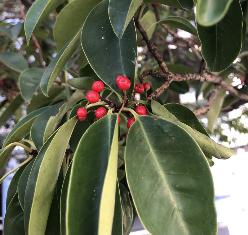 常緑の葉に真っ赤な実をつけるクロガネモチ。