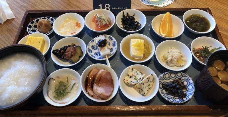ひと口の量で16品のおかずとご飯にお味噌汁。