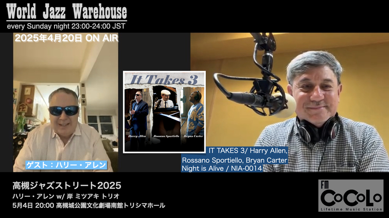 今夜は、その第三弾として、テナーサックス奏者はrー・アレンが登場!ニューヨークからリモートで出演し、最新作「It Takes 3」や高槻ジャズ帥ロートへの意気込みを語っていただきます。