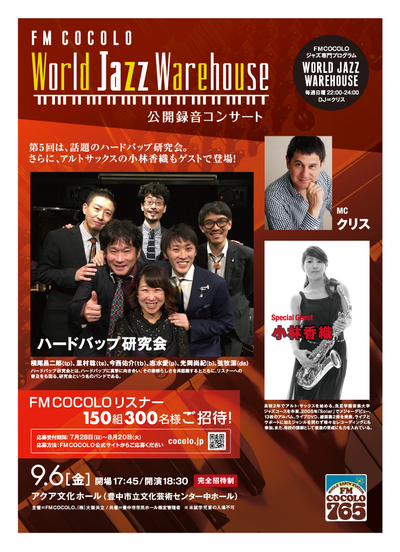 今年はモダンジャズ黄金時代の楽曲を演奏する6人編成のハードバップ研究会にゲスト小林香織が出演します。彼らの演奏、司会を務める番組のDJ クリスとのトークなどを直接お披露します。
