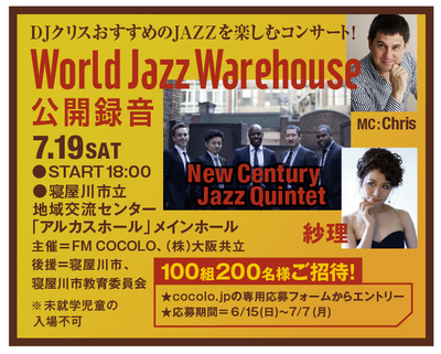 内容:6月25日にデビューアルバムをリリースされる日米混合の新生5人編成バンド New Century Jazz Quintet と東京を拠点に活動しているシンガー紗里の演奏、クリスの初心者でもわかるトーク、及び出演者へのインタビュー。