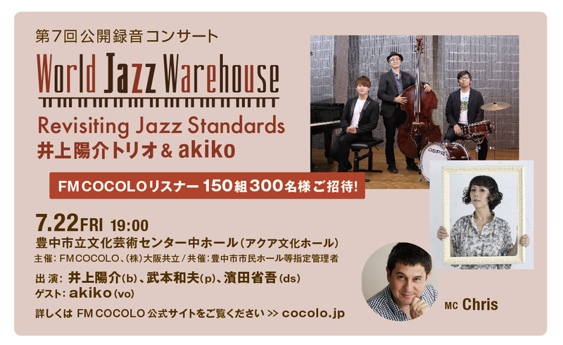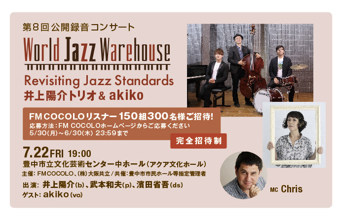 第8回ワールド・ジャズ・ウェアハウス公開録音コンサートは、7月22日(金)19:00 から豊中市立文化芸術センター中ホール(アクア文化ホール)にて開催されます。