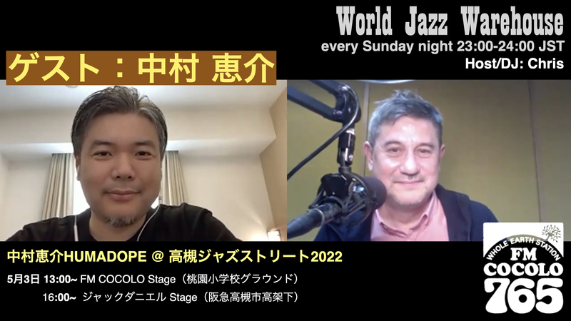 今夜は、3年ぶりに開催する高槻ジャズストリート出演者シリーズ最終回として、トランペッター中村恵介が登場します。今回、出演するバンドHUMADOPEの紹介や演奏内用についてお聞きします!