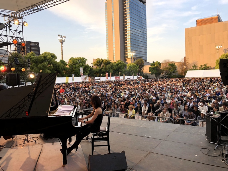 また、先週に引き続き、新型コロナウイルス感染拡大の影響で中止となった高槻ジャズストリートに予定していた出演者の楽曲をお届けします。今夜は、Shiho、寺久保エレナと西山瞳 NHORHM に TOKU が先日リリースした新作から一曲。(画像は去年の高槻ジャズストリート FM COCOLOステージの袖から見た山中千尋トリオの演奏)