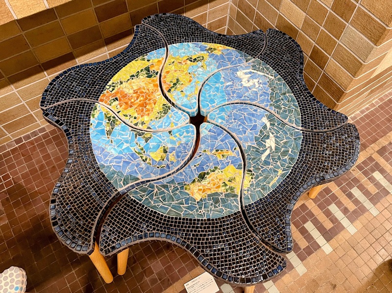 背後にある大きな作品は、工事や建設現場で防音や防塵に使う分厚い生地を使ったもの。これもきっちり、つながります。しかも、いろんなつながり方ができます。めっちゃ実用的なアートじゃん! 全国の建設関係の皆さん、こんな素敵な作品で現場を彩れば、殺風景な工事の風景がガラリと変わると思うんですよ! いかがです?
