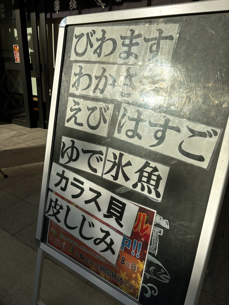 ただ、地元のものを扱う鮮魚店は、当然ながら日によって品揃えに違いがあります。店に入ってからしかわからないと不便ですよね。そんな消費者の考えをわかってのことでしょう。僕がよくウロウロしている湖西の魚屋さんでは、店頭にこんな看板を出して、その日の仕入れ内容を明示してくれているんです。