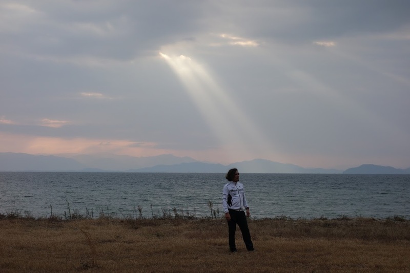 どうですか、この朝日の差し込み方。曇った空が割れ、そこから幾筋かの光が湖面へ。この神々しさよ。そして、僕のジョギング後のジャージ姿の酷さよ。
