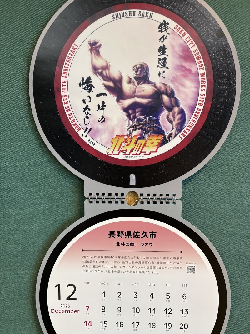 先日はニュースを伝えるべく僕の対面に座った田中乃絵さんが、「そこのカレンダーは11月のままですね」と指摘してくれました。あかんあかん! 僕は尾上さとこさんがお持ちになったと思しきマンホールカレンダーをめくって、腰を抜かしました。だって、そこにはラオウがいたんですもの。