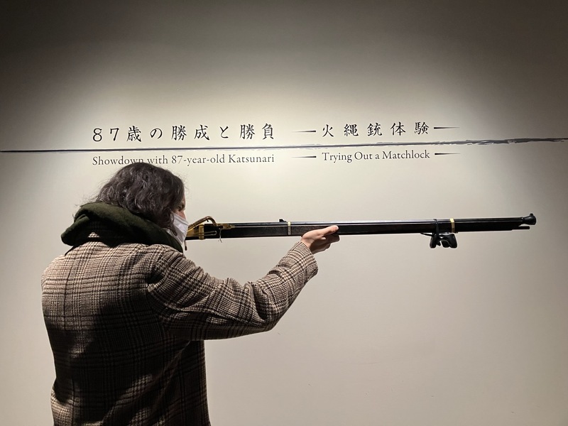 当時としては結構長生きされたようでして、87歳の時のエピソードがすごいんです。こうした火縄銃を手にして、何十メートルと離れた的を射抜いてみせたのだとか。その逸話をバーチャルに体験できるコーナーがありまして、やってみましたよ。ちょいと端っこ気味ではありましたが、野村雅夫、44歳、しっかり命中させました。わ〜い!