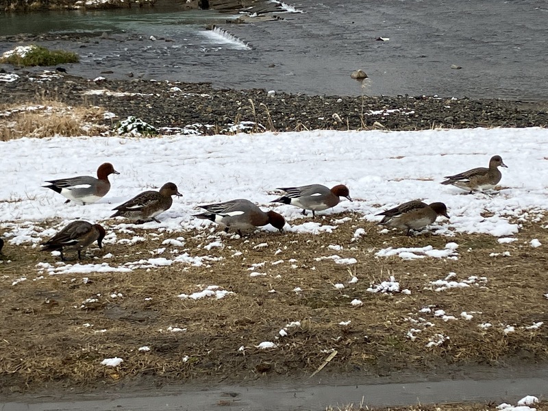 そう、鴨って、陣形を組むのが見ていて面白いんですけど、さすがにやはり寒いのか、群れのまま岸に上がってきて、何やらついばんでます。何を食べてるんでしょうね。