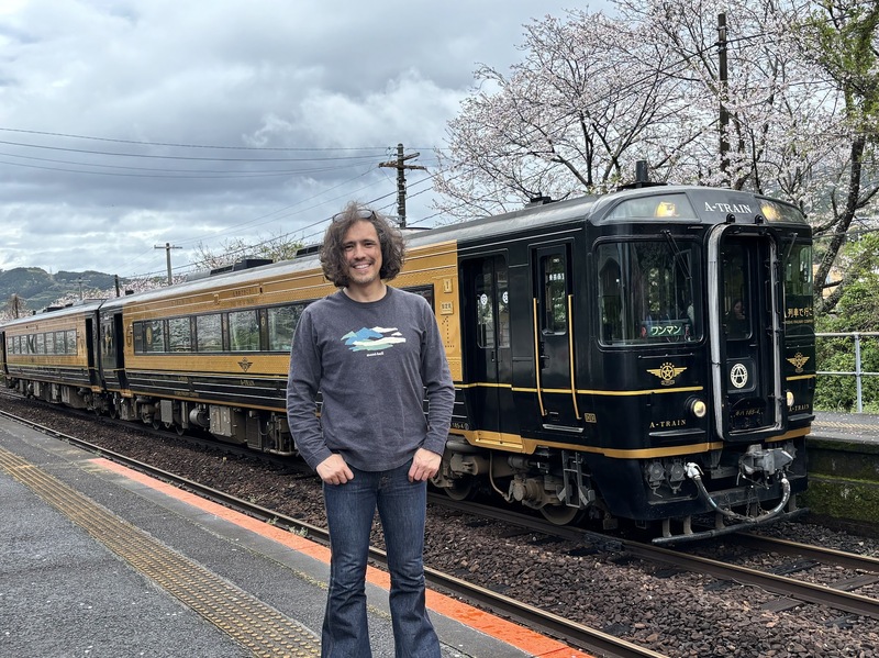 網田駅では桜がちょうど満開で、乗客は地元の皆さんのお出迎えを受けながら、それぞれにしばしの途中下車を楽しんでいらっしゃいました。その隙に、ちゃっかり記念撮影。次はA列車を撮るのではなく、乗りたいな。