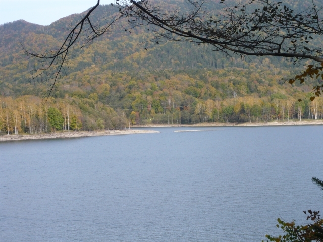 秋の終わりに満水となる湖は、冬の発電で水位を下げ、
