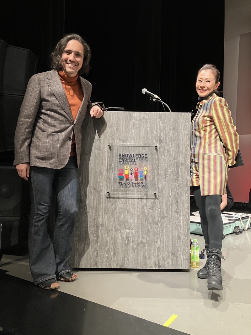 ナレッジ・シアターのステージにある演台を囲んでいるのは、セレモニーとパーティーで総合司会を務められた池田なみ子さん。その美声と見事な機転で頼もしいMCでいらっしゃいました。その横は、OMOSIROI ナビゲーター、まちゃおです。我ながら、すごい肩書きをもらったものだ。振り返ると、ステージで興味の赴くままに受賞者や審査員とわちゃわちゃ喋って騒いでいただけのような気もしますが、とにかく知的好奇心が大はしゃぎするOMOSIROI内容だったのは間違いない。3月のCIAO火曜日での報告にご期待ください。