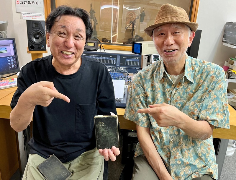 写真は番組内で語られた「はっぴいえんど」とのレコーディング記録が記された1972年の手帳を手にした三浦光紀さんと田家秀樹さん。