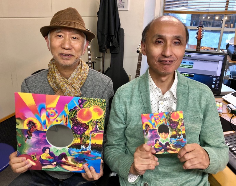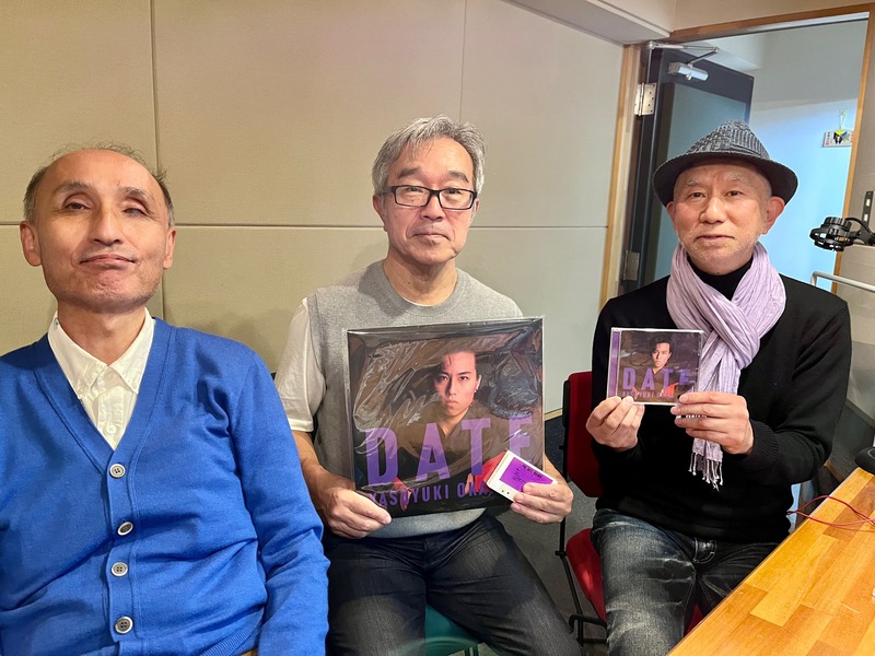 写真は、左から、福田良昭さん/当時のアナログ盤「DATE」と番組内で話題になったプロモーション・カセットを手にした西岡明芳さん/田家秀樹さん。