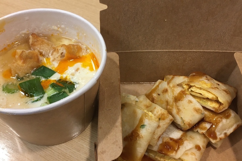 (写真は、そのお店のテイクアウト。左が鹹豆漿。右がモチモチの葱油餅 )