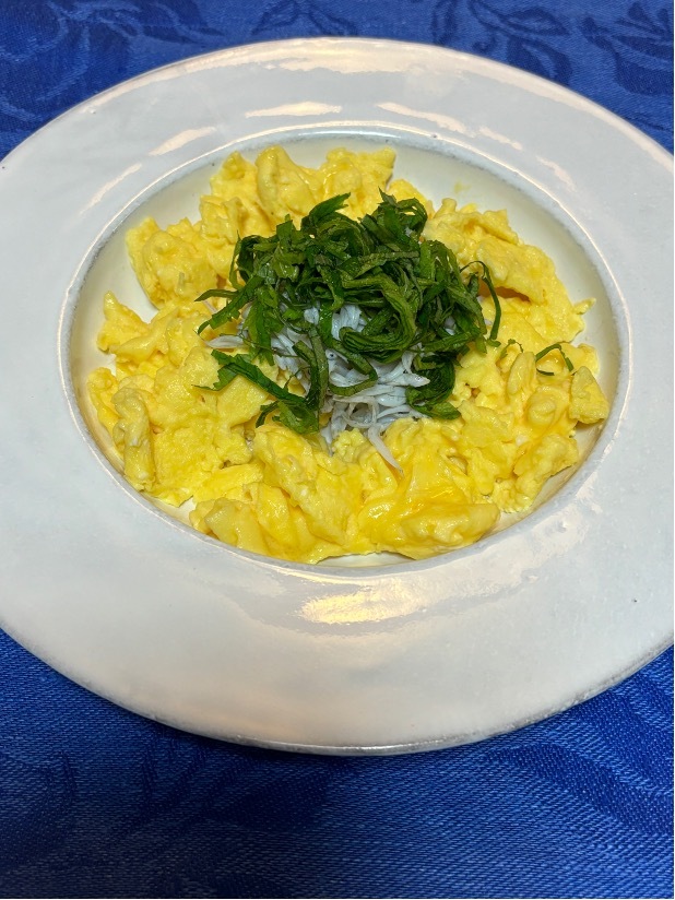 炊き上がったら一人前取り分けて、ボウルに卵3個を割り塩胡椒しよく混ぜて、