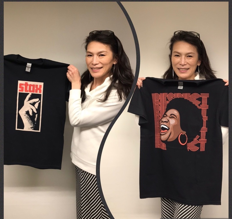 月曜日にプレゼントした、アレサTシャツ & STAX Tシャツの現品をあててみるmemeさん。