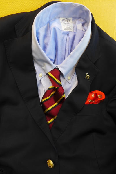 ボタンダウンのシャツ(ブルックスブラザーズ)に、レジメンタルのネクタイ、紺のブレザー。パンツはグレイフランネルかチノパン。
