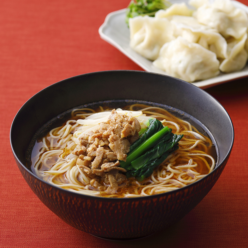 この水餃子に合わせるのは、身体にやさしいさっぱりスープの黒酢麺。