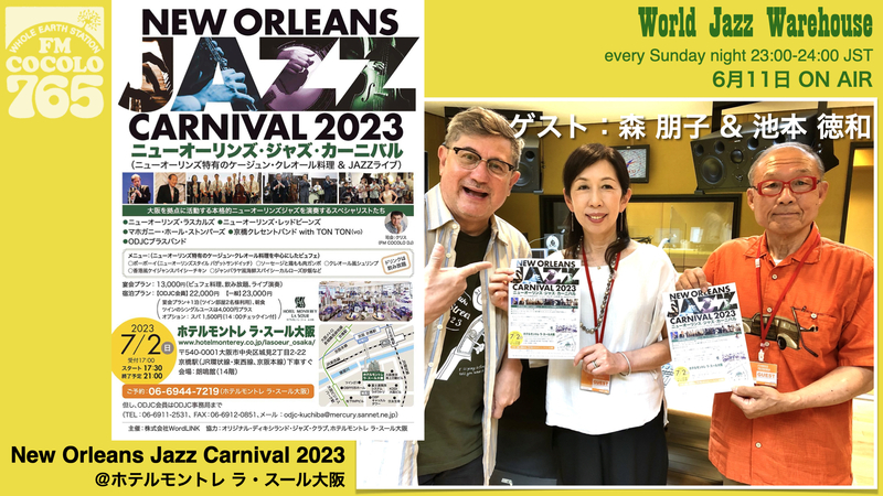 そして、今夜、スタジオにはニューオーリンズで生まれた古いジャズをこよなく愛する二人ヴォーカルの森朋子とトランペット奏者 池本徳和をゲストに迎え します。彼らは、僕がプロデュースするニューオーリンズ料理も楽しめるディナーショーにご出演 されます。ニューオーリンズ・ジャズの魅力を語っていただいた上、ディナーショーの内容をご紹介していただきます。