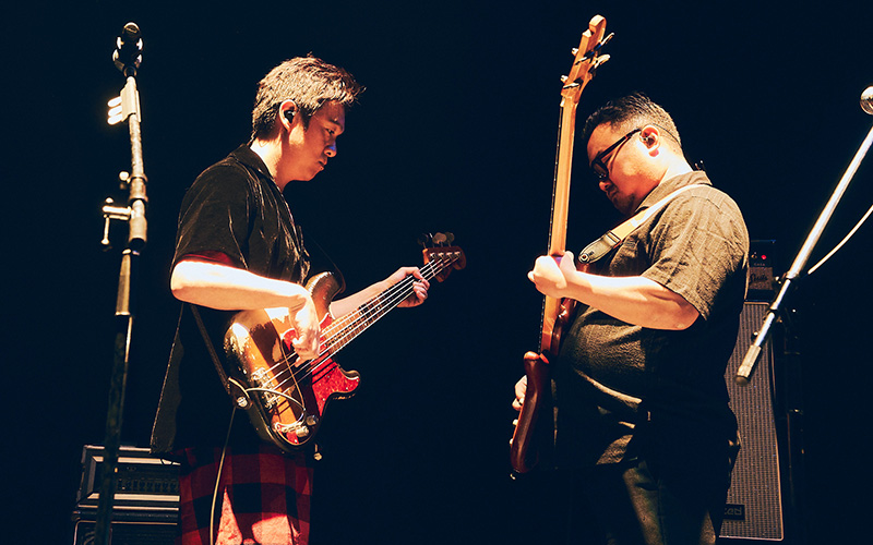 客電が落ちると、二人のシルエットが静かに浮かび上がる。ステージ中央で向かい合い、互いにベースを構える丸山と休日課長。Grover Washington Jr.「Just the Two of Us」のイントロが始まり、ホールの空気が一気に澄んでいく。リズムセクションには河村吉宏(Dr)、清野雄翔(Key)、真壁陽平(G)が控え、柔らかなグルーヴを刻む。しかし主役はあくまで二人のベース。丸山がエフェクターで歪ませた低音を鳴らせば、課長がスラップで返し、音が絡み合う。ジャズでもロックでもない、二人にしか描けない独自の低音の会話。互いを見つめ合いながら微笑む姿に、「ベースの日」の象徴のような信頼関係が滲んだ。