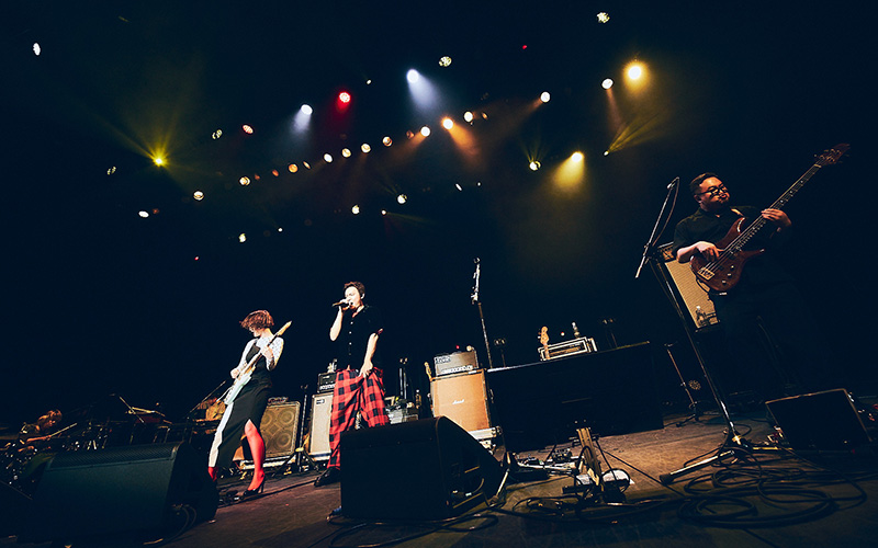続けて披露されたのは、丸山が主演を務めたミュージカル『ヘドウィグ・アンド・アングリーインチ』からの「Sugar Daddy」。イントロが流れると、客席から歓声が上がる。丸山は妖艶な仕草でマイクを握り、腰をくねらせながらステージを練り歩く。「TOKIEのベース、どう? 滅多に聴けるもんじゃないんだからね、あんたたち!」と、ヘドウィグになりきったセリフを放つと、客席は大歓声に包まれた。二人の掛け合いはまるで音で繰り広げるダンスのよう。TOKIEのグルーヴと丸山のパフォーマンスがぶつかり合い、フロアの熱量がさらに上昇していった。