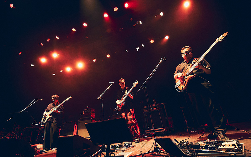 続いて課長を呼び込み、Coldplay「Viva la Vida」をカバー。武田がルーパーでフレーズを重ね、二人とは思えない厚みのあるサウンドを作り上げる。ボディを叩き、歪ませ、音のレイヤーを積み上げながら、ベースという楽器の概念そのものを更新していくようなステージ。さらに丸山を呼び込み、三人での「Layla」(Eric Clapton)。武田がエフェクトを駆使してベースであのギターフレーズを再現すると、観客の間から思わずため息が漏れた。低音のうねりがステージ全体を包み込み、この夜の“グルーヴの核”が確かに形を帯び始めていた。