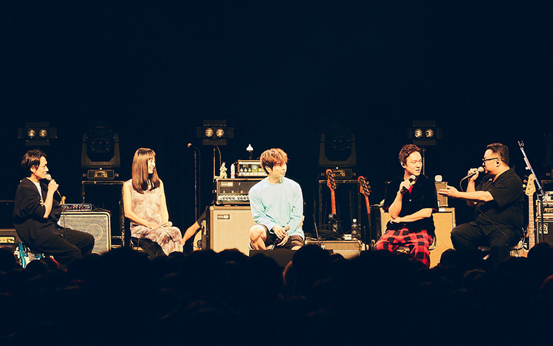 ライブはいよいよ終盤。ホストの丸山と課長、ゲストの武田、TOKIE、田村の5人が並び、トークコーナー「BASS SUMMIT」が始まる。5人のベーシストによる真剣な音楽談義になるかと思いきや、まるでライブ前の楽屋でミュージシャンたちが与太話しているところを盗み聞きしているような、そんな親密で愉快なひとときとなった。