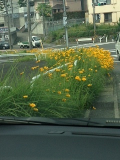 この黄色い花が歩道と車道の境目にず〜〜っと続いて、、